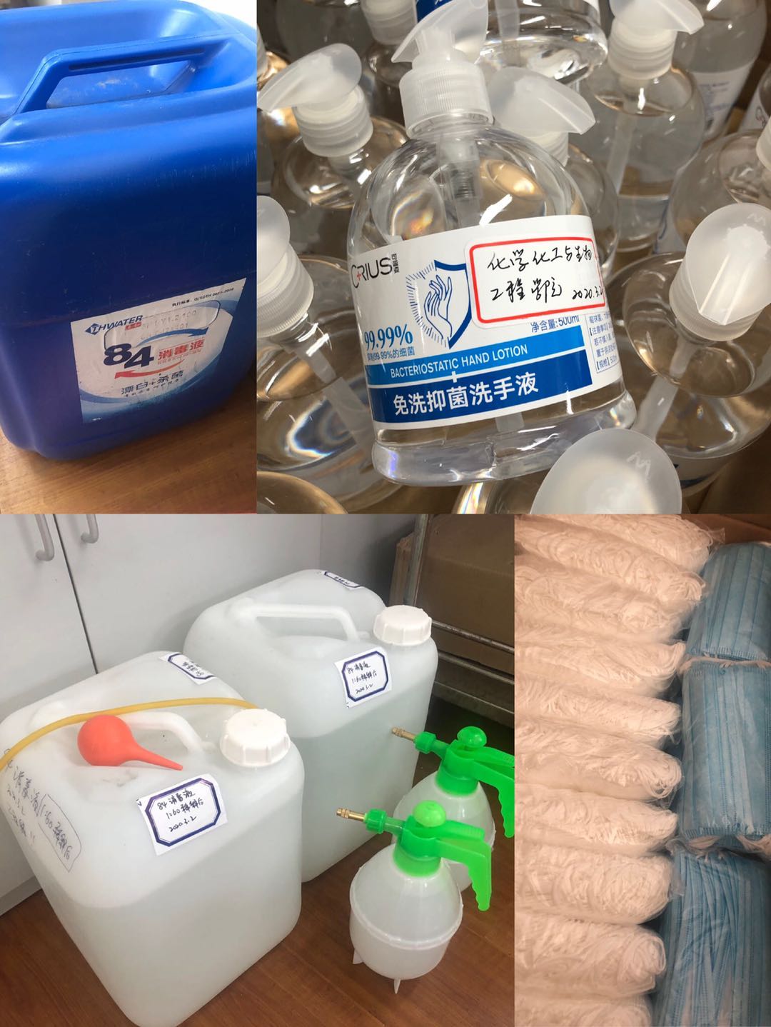 为了做好疫情防控,学院准备了防护口罩、洗手液、84消毒水和喷壶等物资,保障老师们顺利到岗工作。