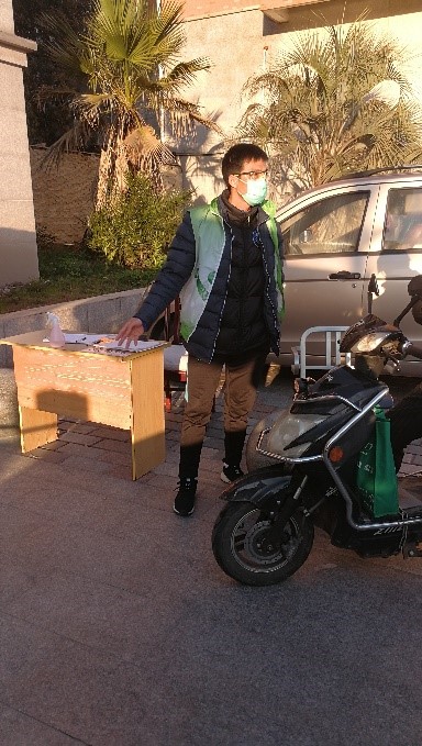 此外,染整学科党支部党员黄劲旭同志,也积极投身于小区疫情防控工作中来。2月15日左右,小区内疫情防控形势严峻起来,外地人员开始返回,小区物业工作人员严重不足,给疫情防控带来很大挑战。并且现有安保人员年龄偏大,工作强度吃不消。因此小区物业招募志愿者之际,黄劲旭同志毫不犹豫地主动担任志愿者,每天工作十几个小时,测试进入小区人员的体温、做好人员出入登记等,受到物业称赞,体现了东华人的责任担当。