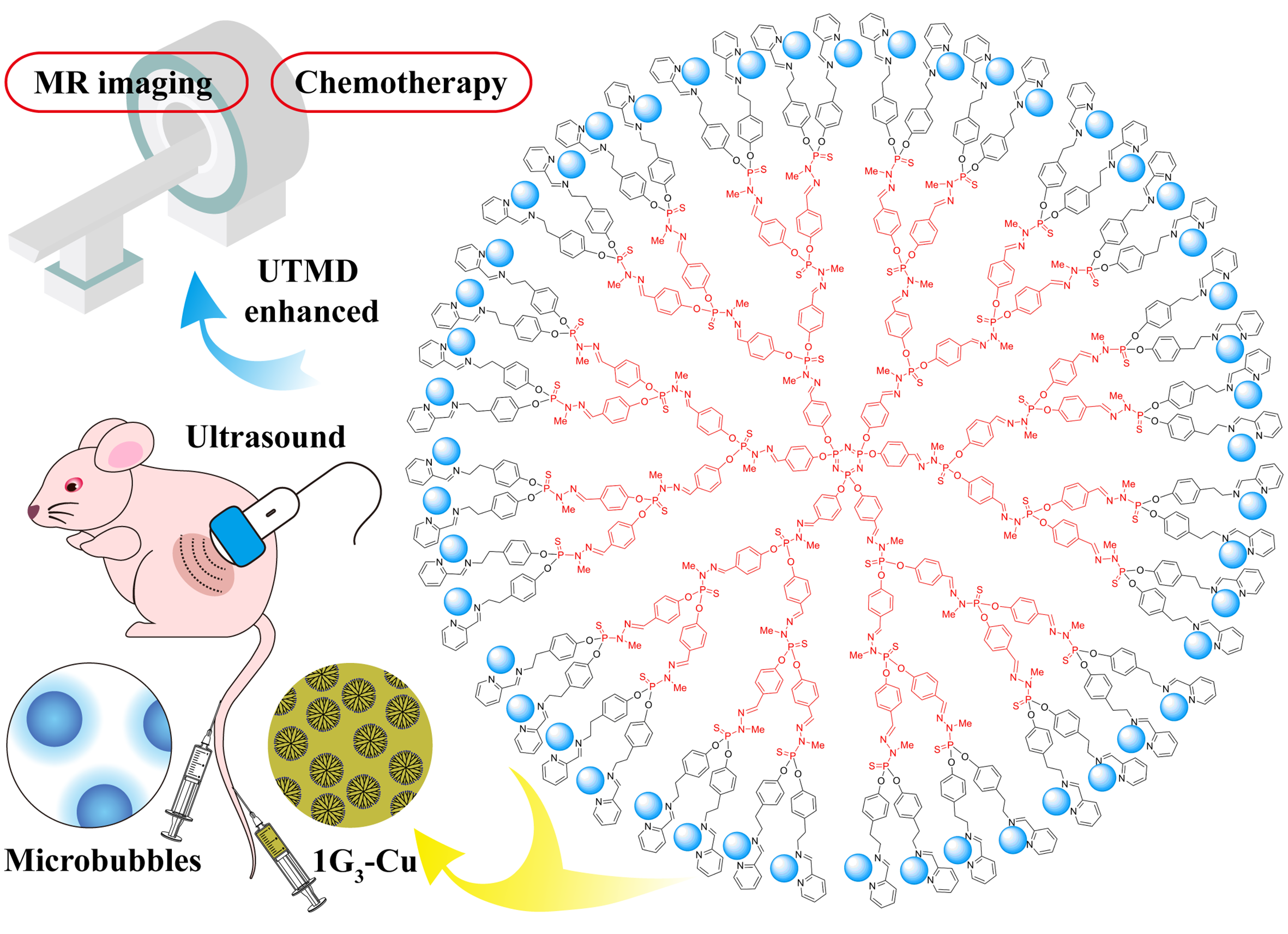 在上述研究的基础上,课题组进一步利用超声技术促进树状大分子铜络合物的诊疗效果。研究团队选择具有精确结构的含磷树状大分子作为载体材料,利用其表面化学在其末端修饰金属配体,进一步螯合铜离子构建树状大分子铜络合物。研究表明,第三代含磷树状大分子铜络合物1G3-Cu具有较好的T1弛豫性能(r1 = 0.7432mM-1s-1),同时对肿瘤细胞具有良好的抑制性,可用于肿瘤MR造影及化疗。在此基础上,研究团队利用超声靶向微泡破坏(UTMD)技术来促进其在肿瘤部位的聚集,通过在肿瘤区域超声辐照,微泡的定向破裂导致细胞膜上瞬间形成非致死性可逆的孔道,造成细胞膜通透性的增加,从而有效增强纳米药物向肿瘤部位的靶向输送。如图2所示,通过联合UTMD技术,1G3-Cu在细胞内的吞噬量大大增加,进而提高其对肿瘤细胞生长的抑制效率。另外,体内MR成像及组织分布结果表明,UTMD技术的应用可以增加1G3-Cu在肿瘤部位的聚集,减少其在肝、肺等部位的分布。体内抗肿瘤实验表明,1G3-Cu联合UTMD技术可以上调肿瘤内Bax/Bcl-2比例、P53和PTEN蛋白表达水平,促进肿瘤细胞凋亡,改善瘤内血流灌注,进而有效抑制胰腺癌模型的生长。组织病理学实验和血常规分析表明1G3-Cu不会对荷瘤鼠的主要器官造成明显损伤,也不会引起健康小鼠血常规指标的明显变化。